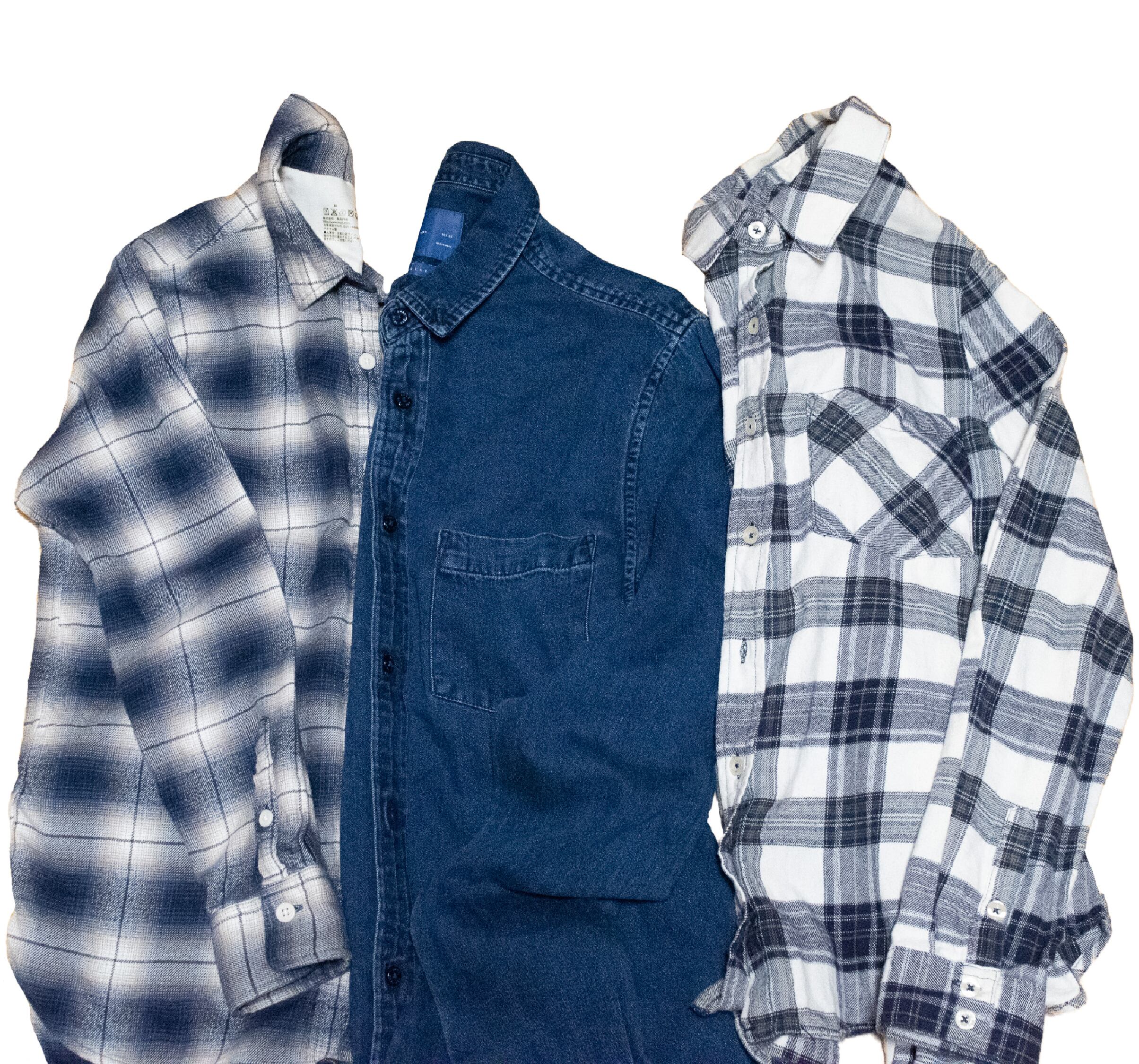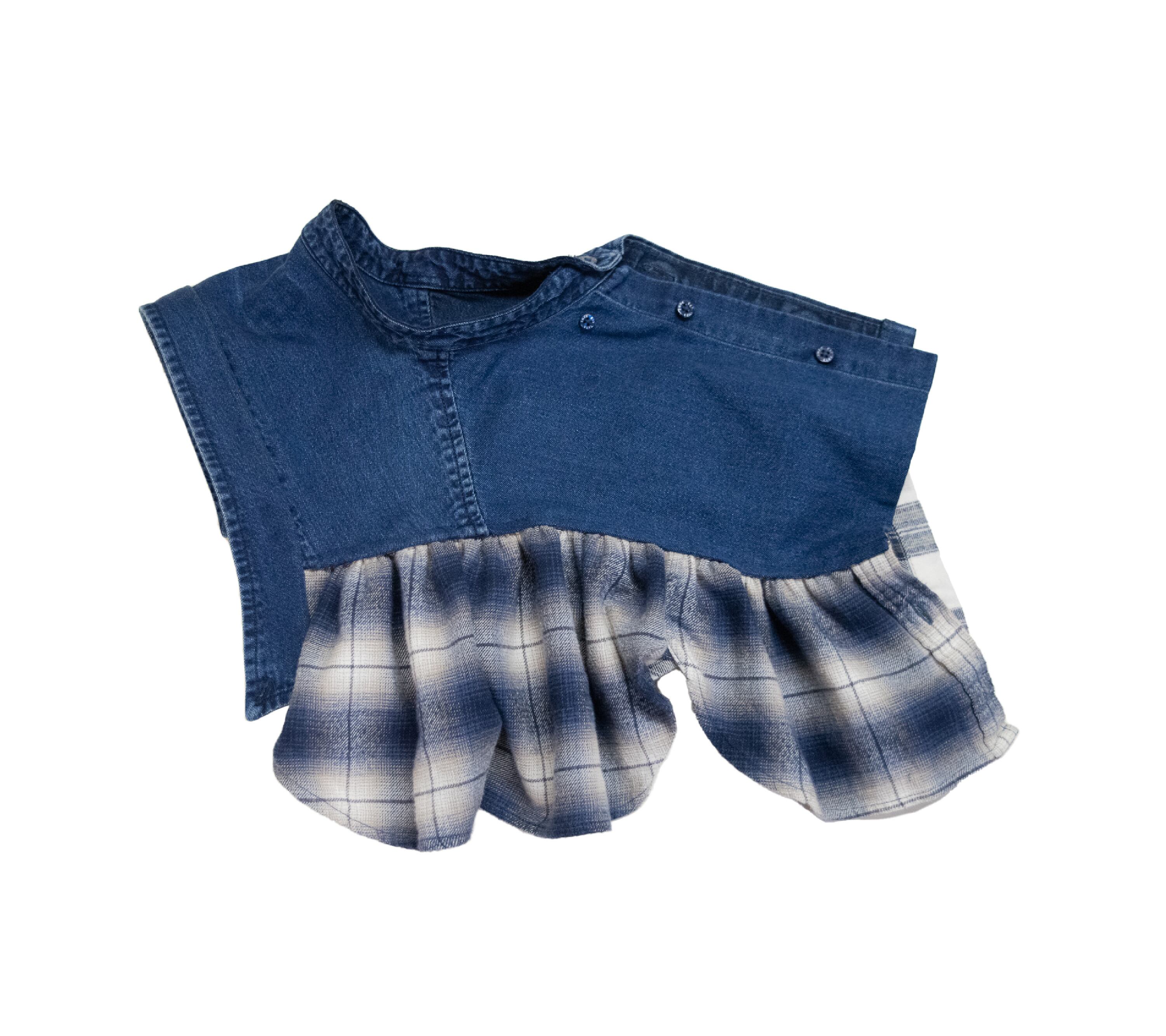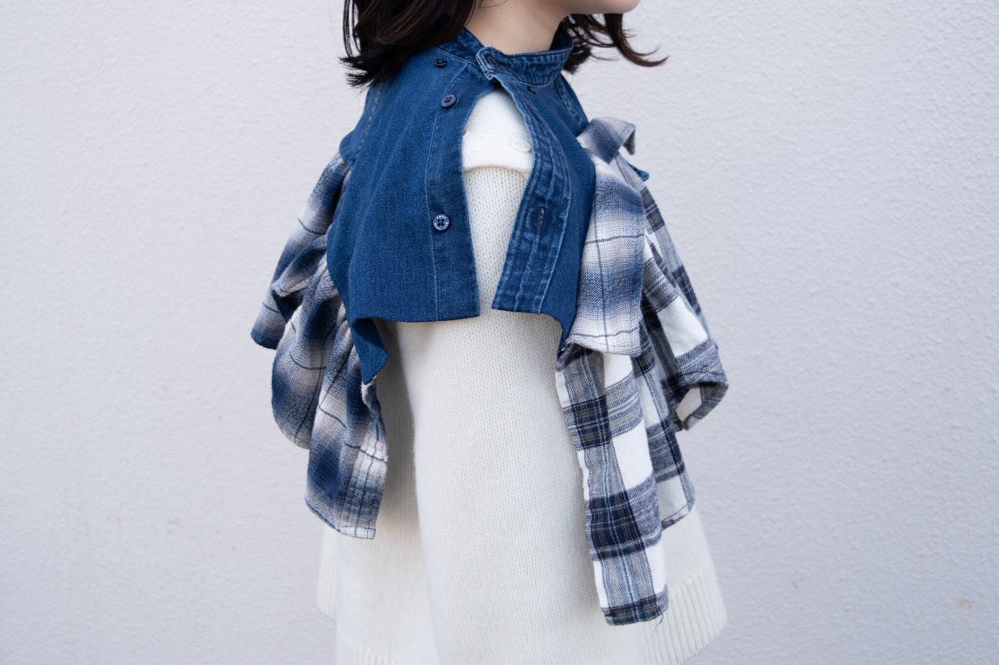 シャツを3枚を使用し、付け襟にリメイクした商品です。商品画像の8枚目は使用したシャツのリメイク前の写真です。