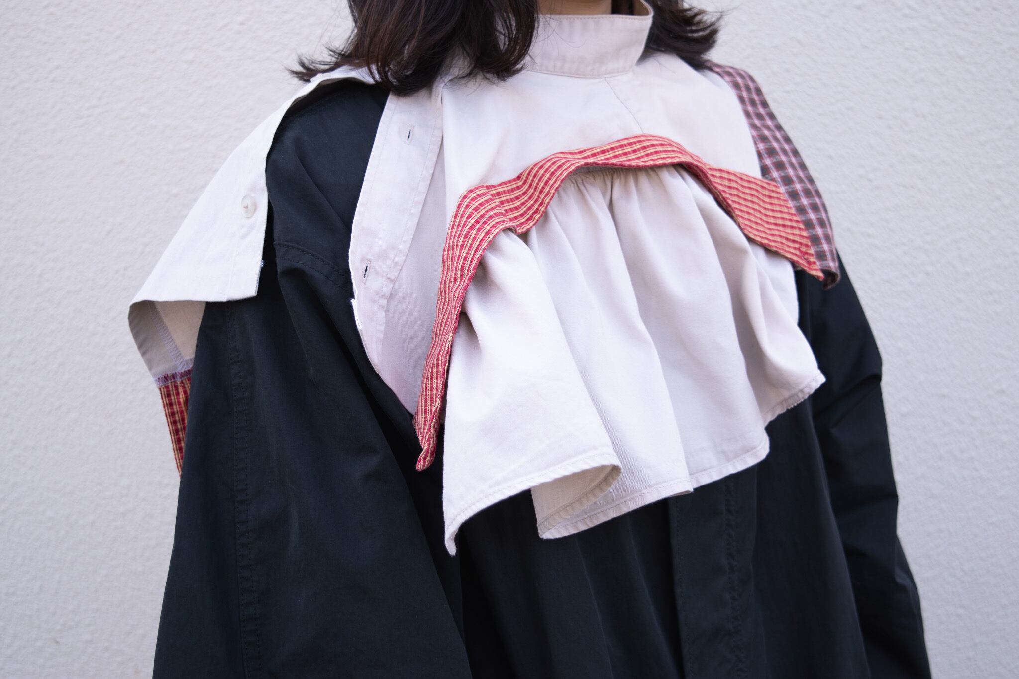 シャツを3枚を使用し、付け襟にリメイクした商品です。商品画像の8枚目は使用したシャツのリメイク前の写真です。