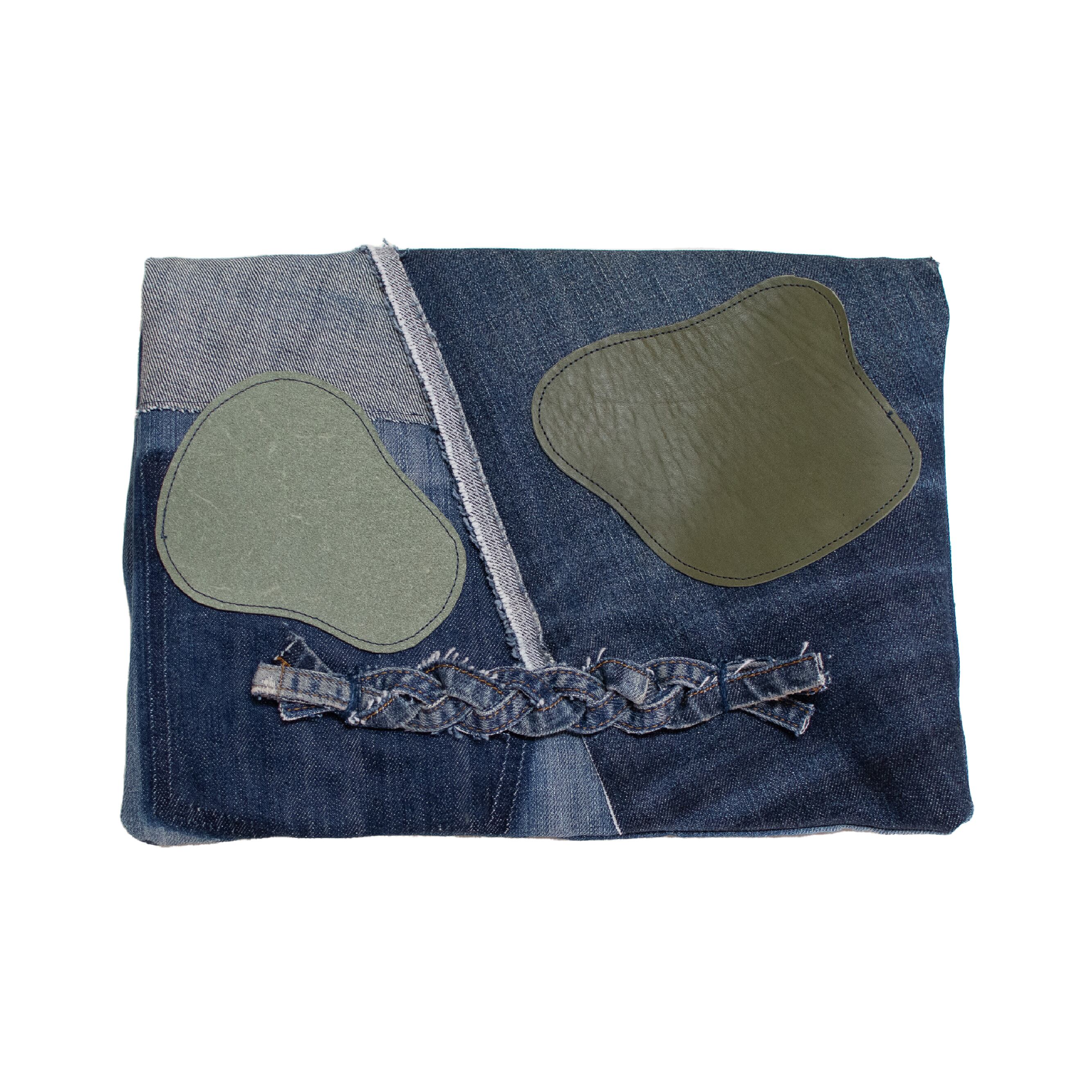 ジーンズでバッグを作り、自由な曲線でカットしたレザーの端材を縫い付けました。