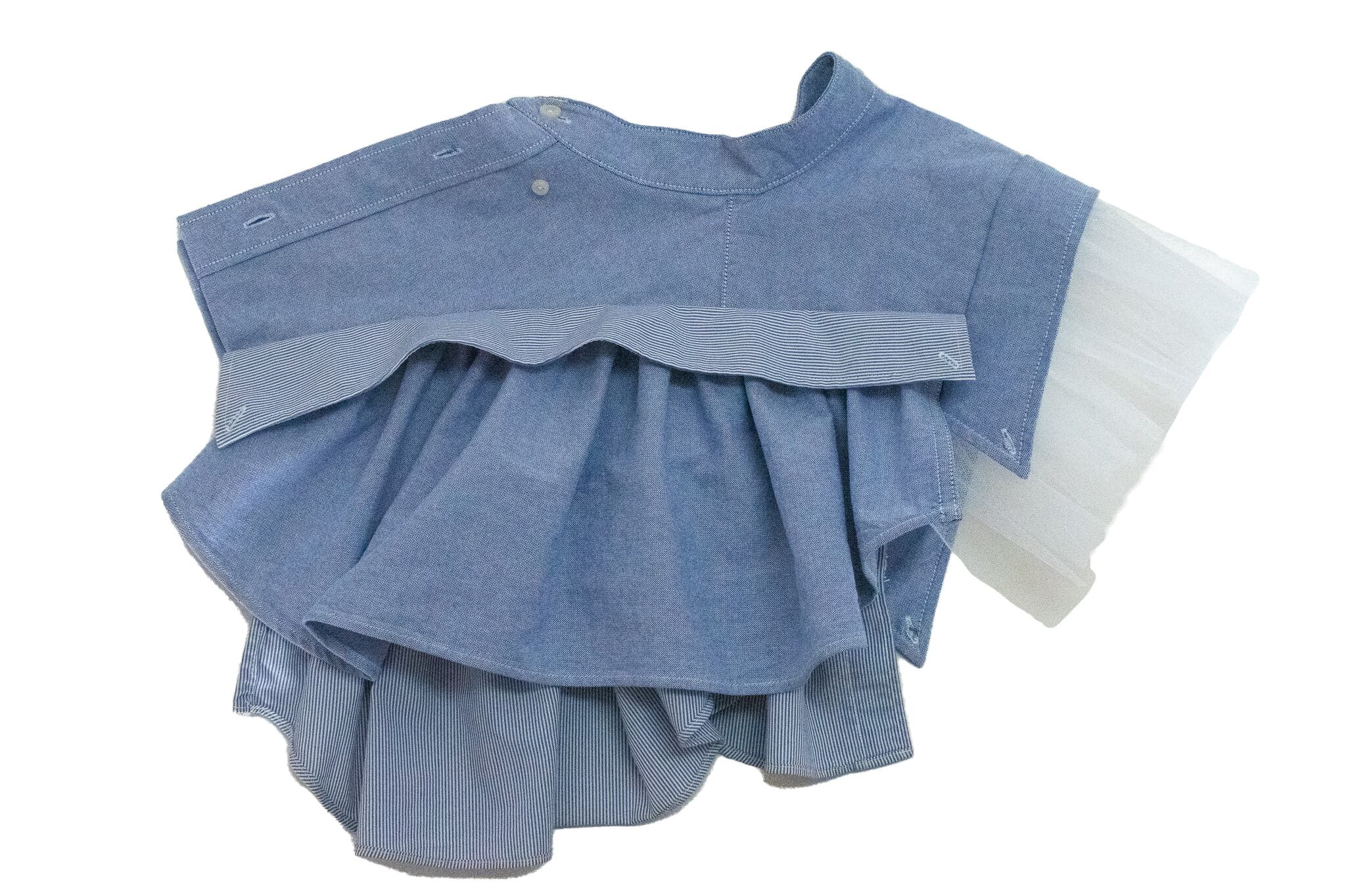 肩の部分にはギャザーを寄せたチュールを縫い付けました。品番NIBT2のスカートとセットアップとしてもご着用いただけます。(写真3〜6枚目参照)