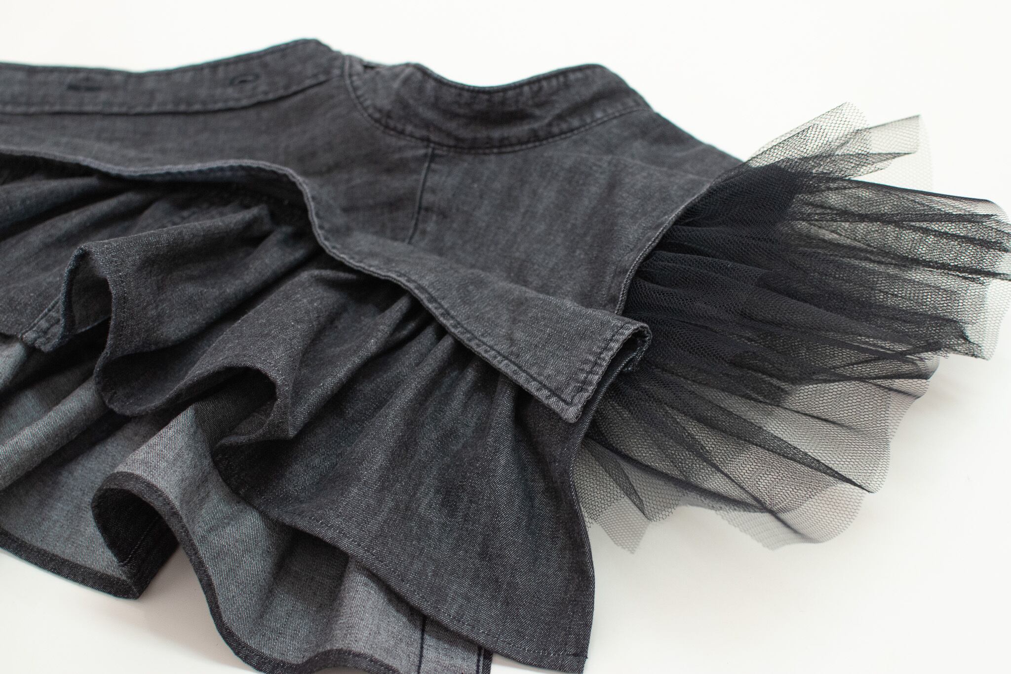 肩の部分にはギャザーを寄せたチュールを縫い付けました。