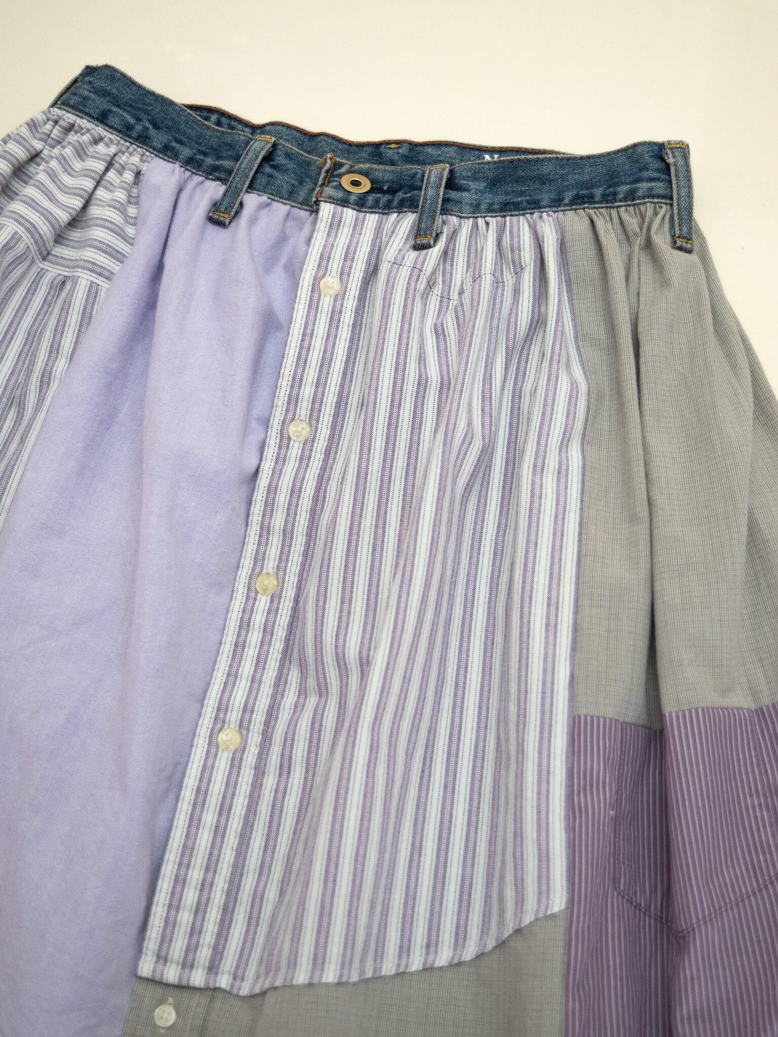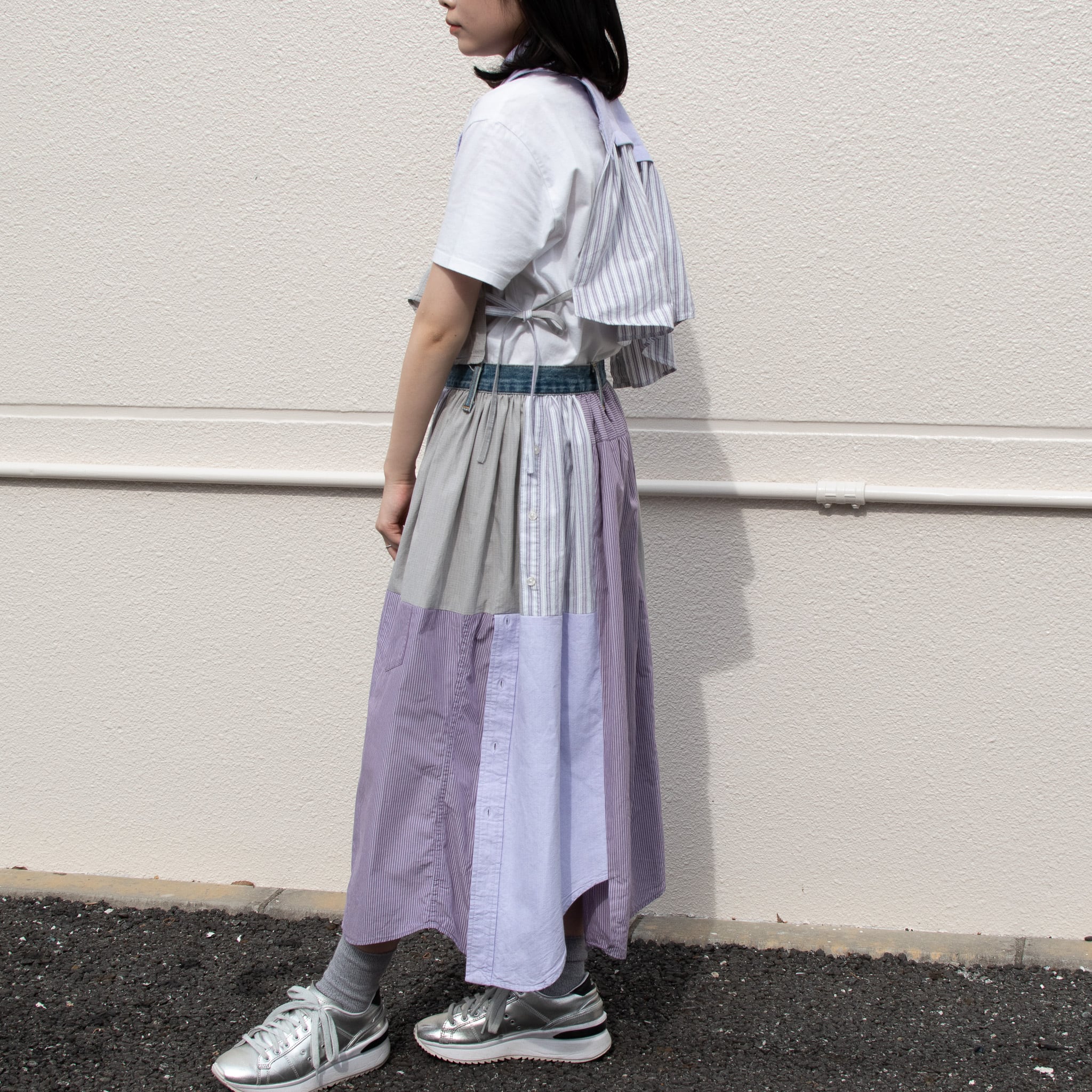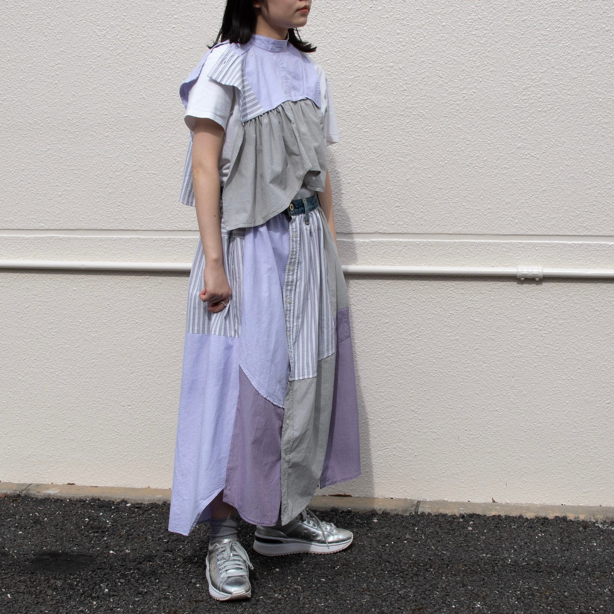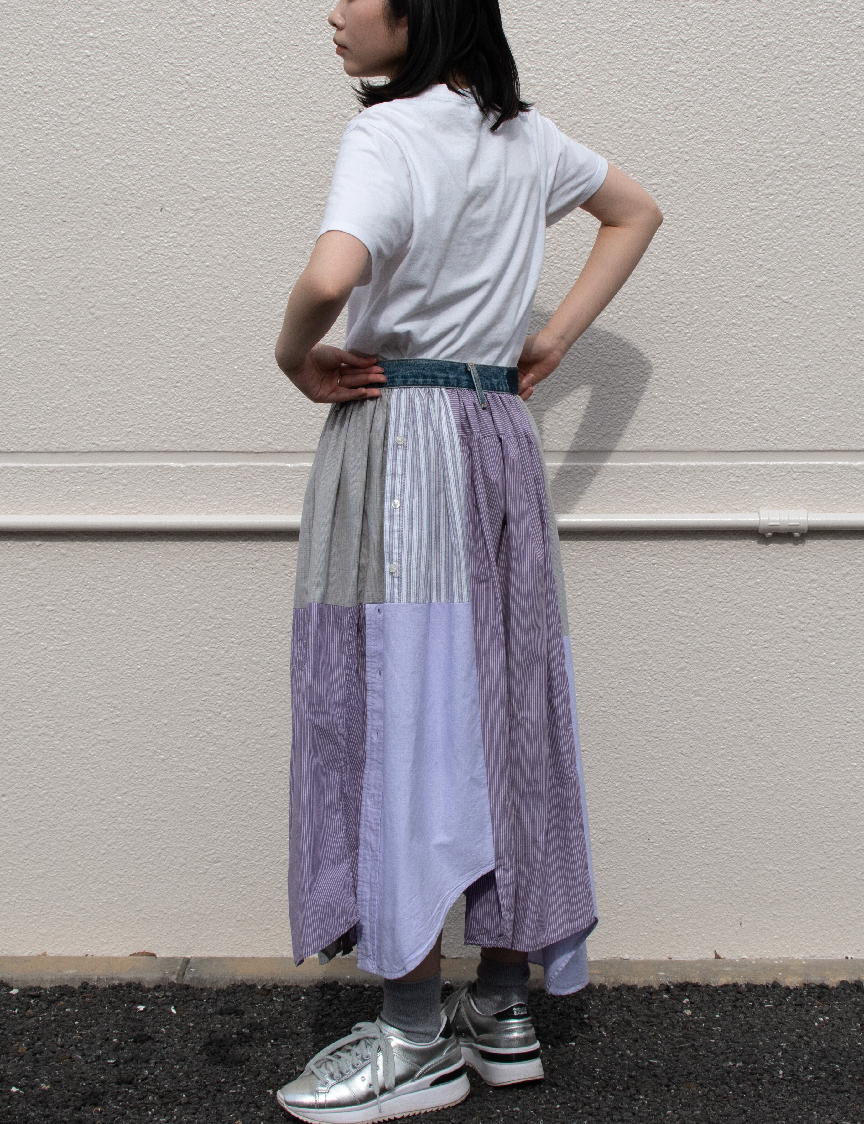 シャツを4枚を使用し、スカートにリメイクした商品です。品番NIUV1のベストとセットアップとしてもご着用いただけます。(写真3.4枚目参照)
