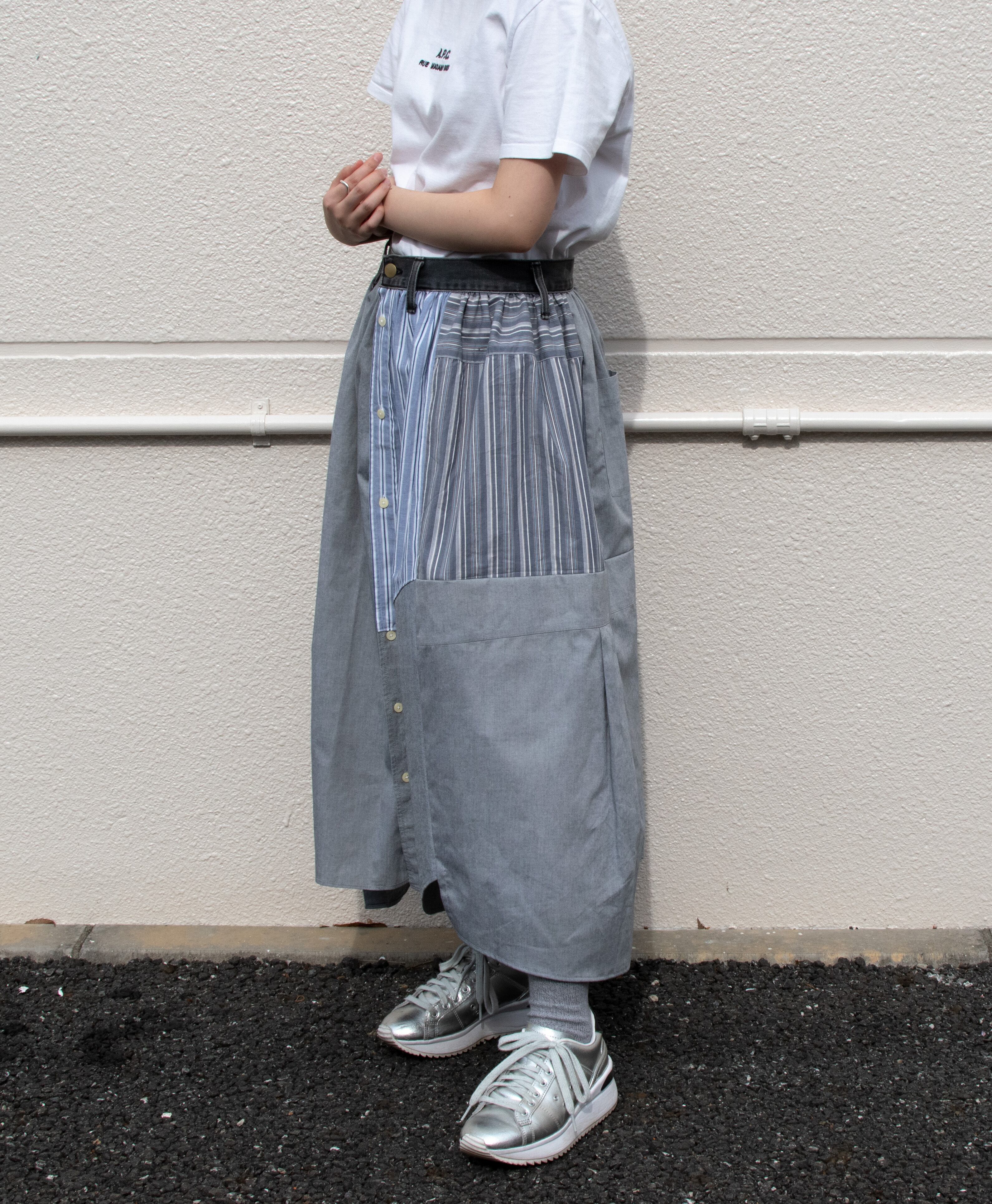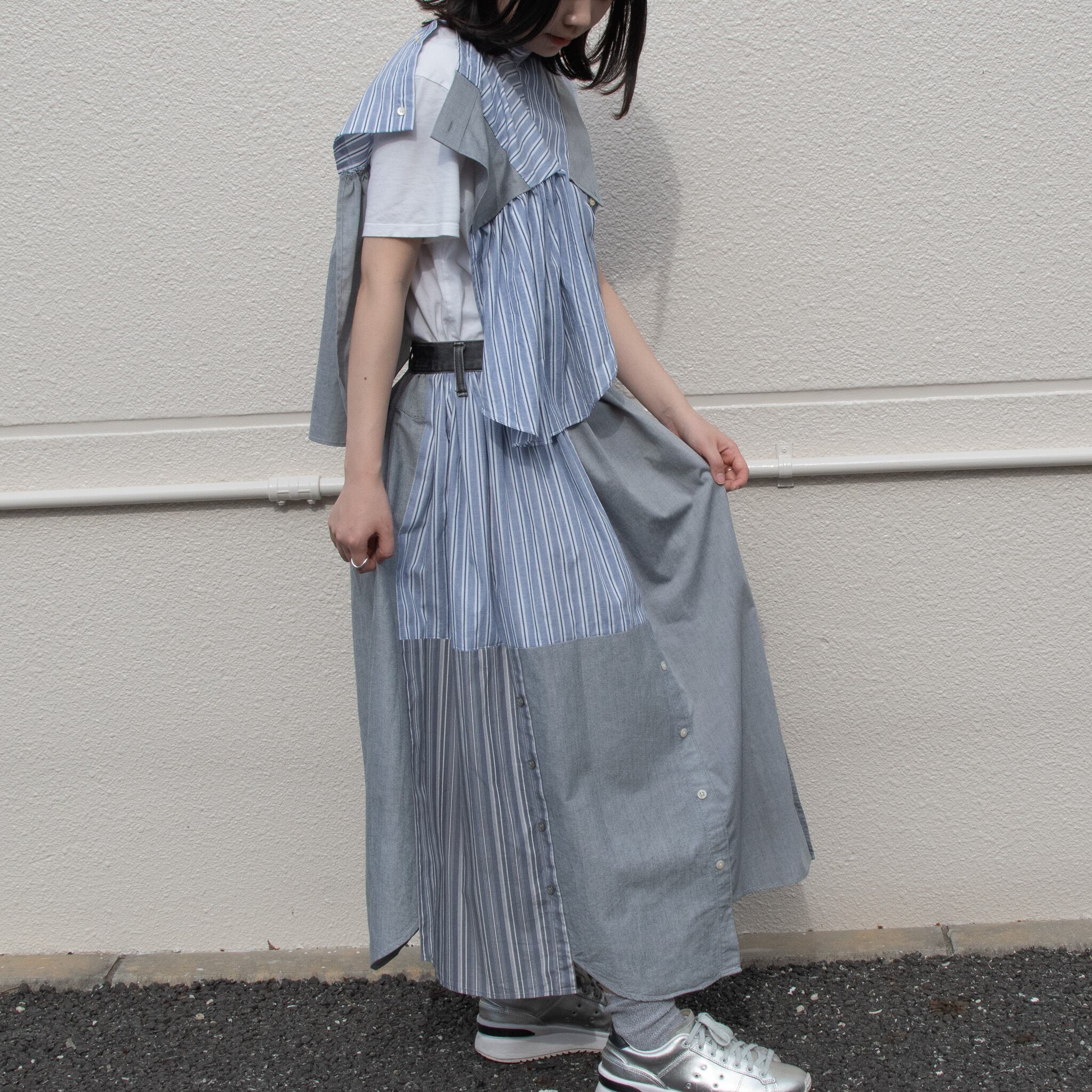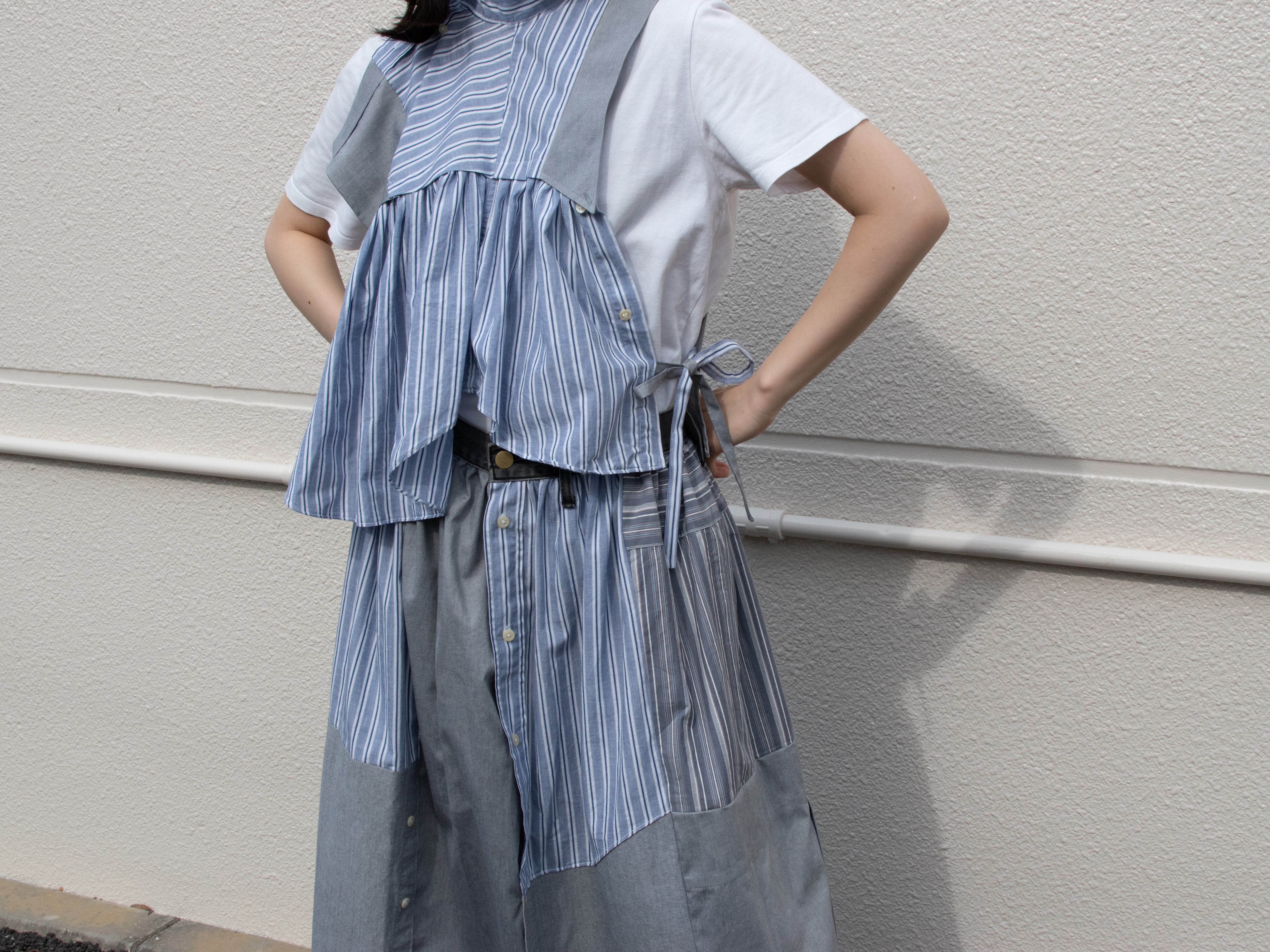 シャツを4枚を使用し、スカートにリメイクした商品です。品番NIUV2のベストとセットアップとしてもご着用いただけます。(写真3.4枚目参照)